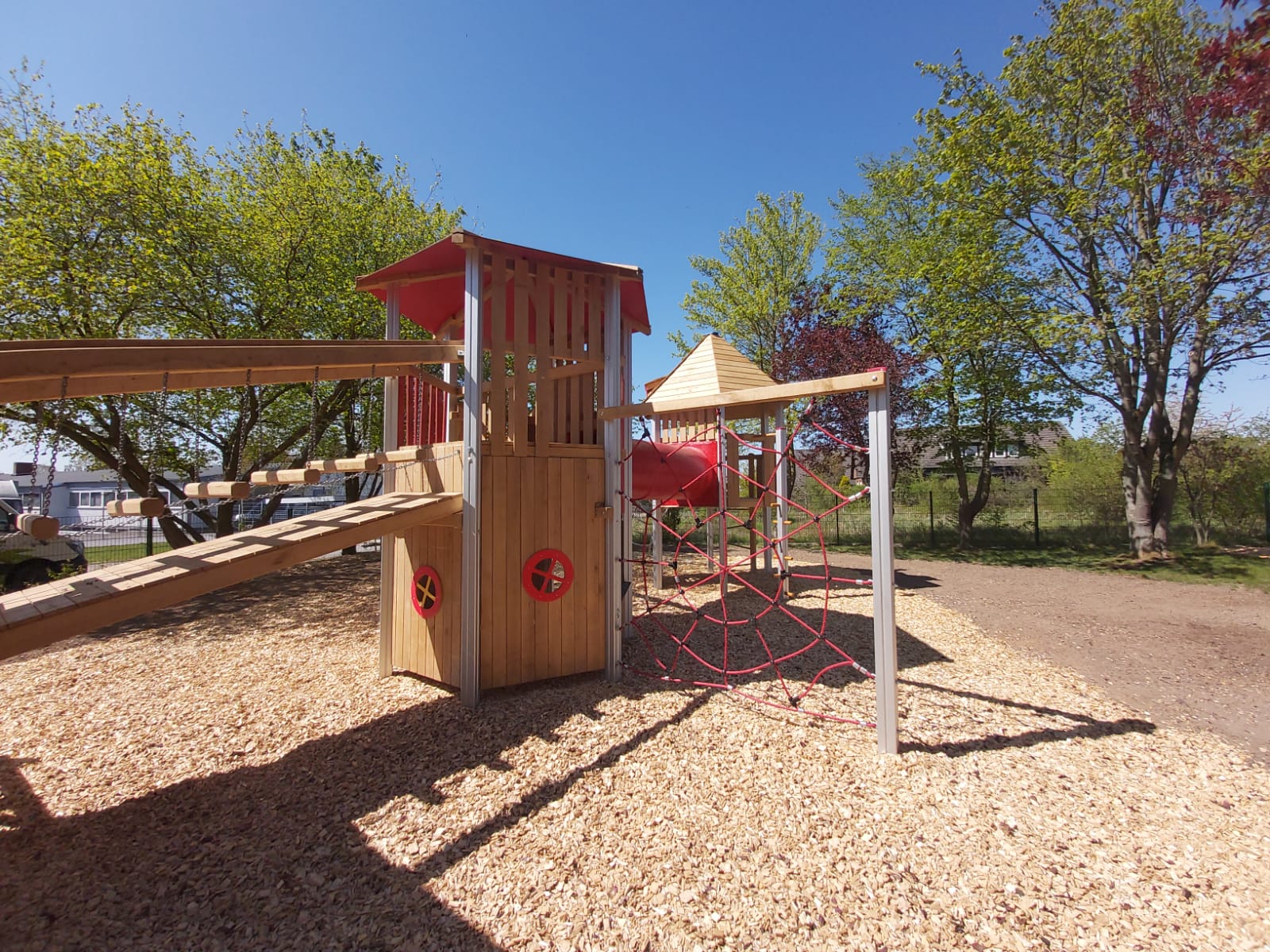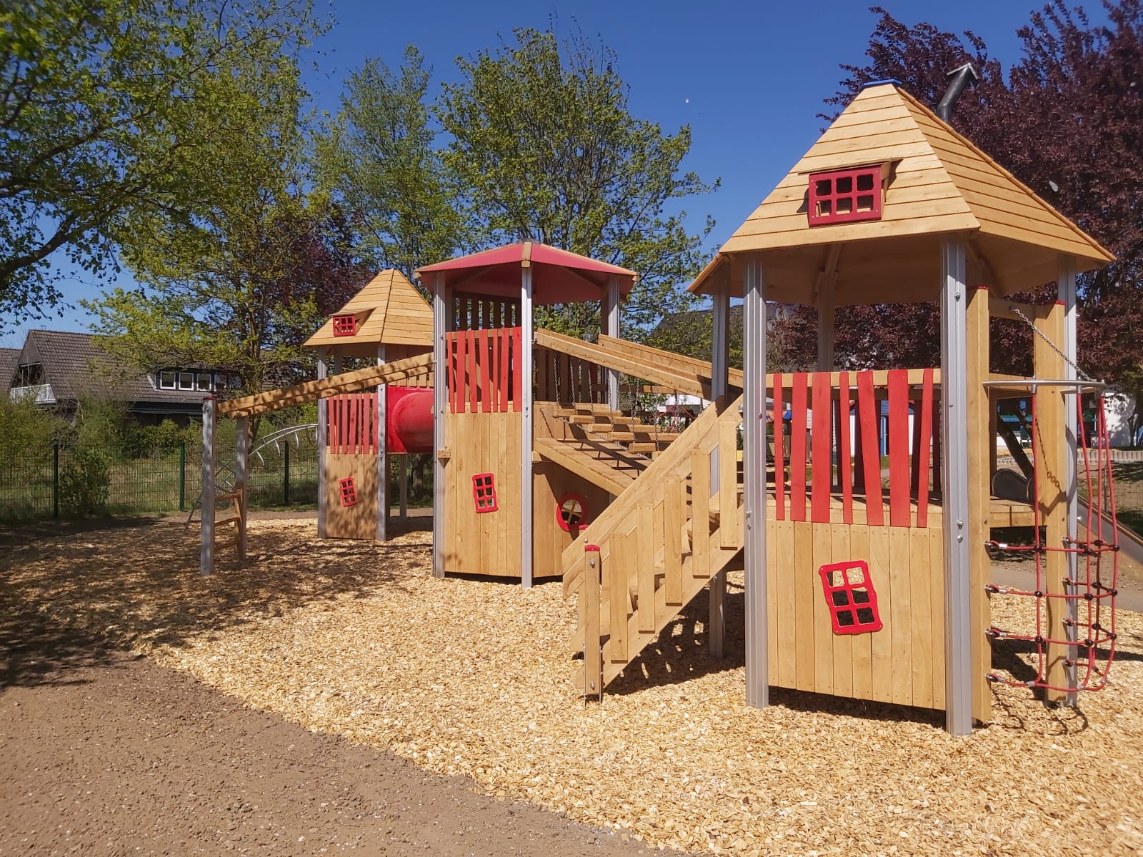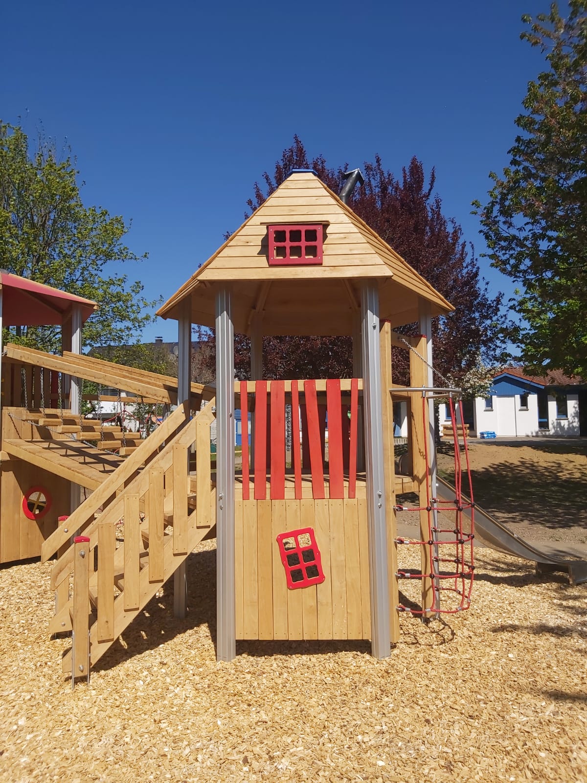 Der Kindergarten des DKSB wurde mit einer großen Dreiturm-Kombination aus Aluminium ausgestattet, die den Kindern abwechslungsreiche Spiel- und Klettererlebnisse ermöglicht.