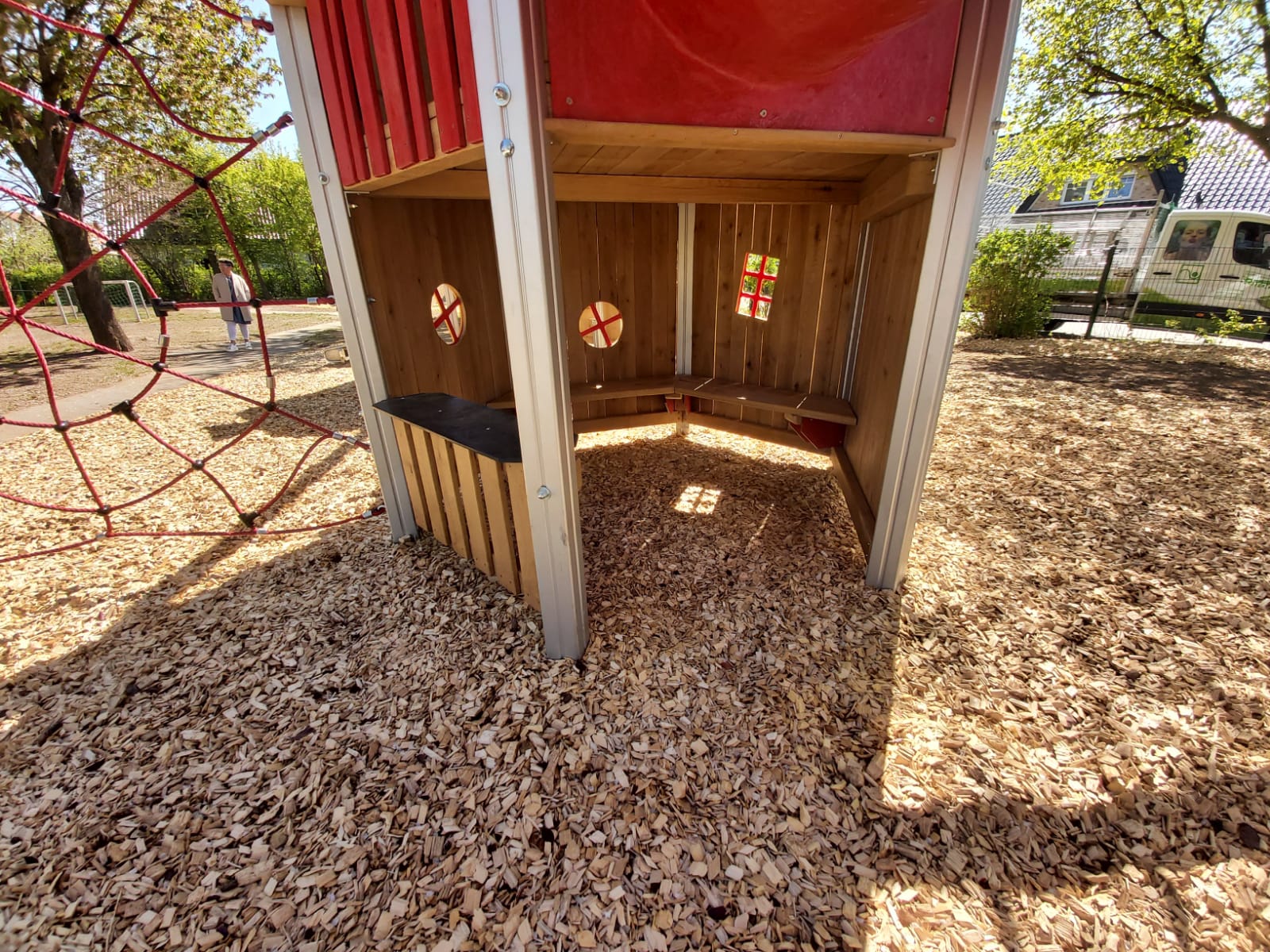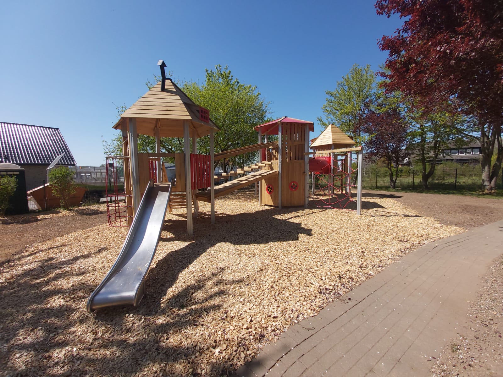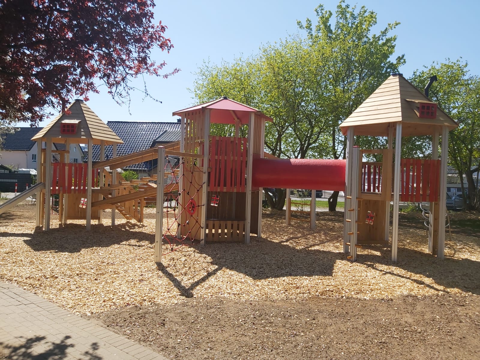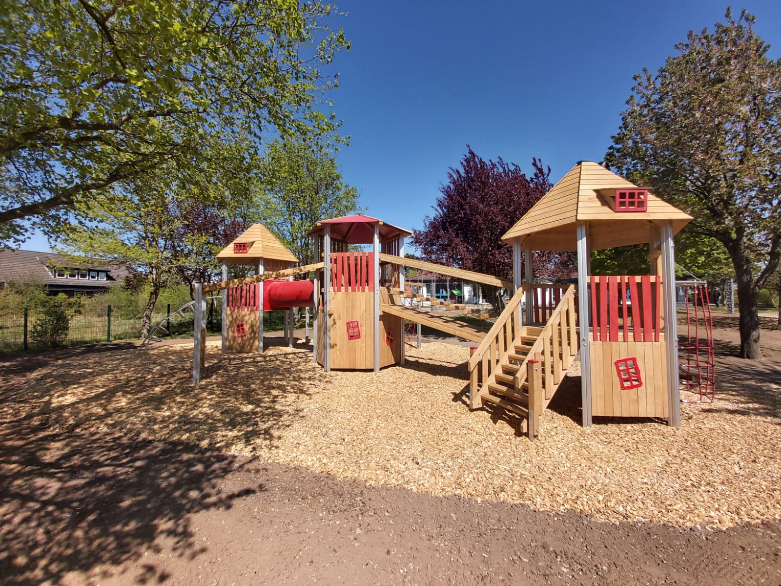 Der Kindergarten des DKSB wurde mit einer großen Dreiturm-Kombination aus Aluminium ausgestattet, die den Kindern abwechslungsreiche Spiel- und Klettererlebnisse ermöglicht.