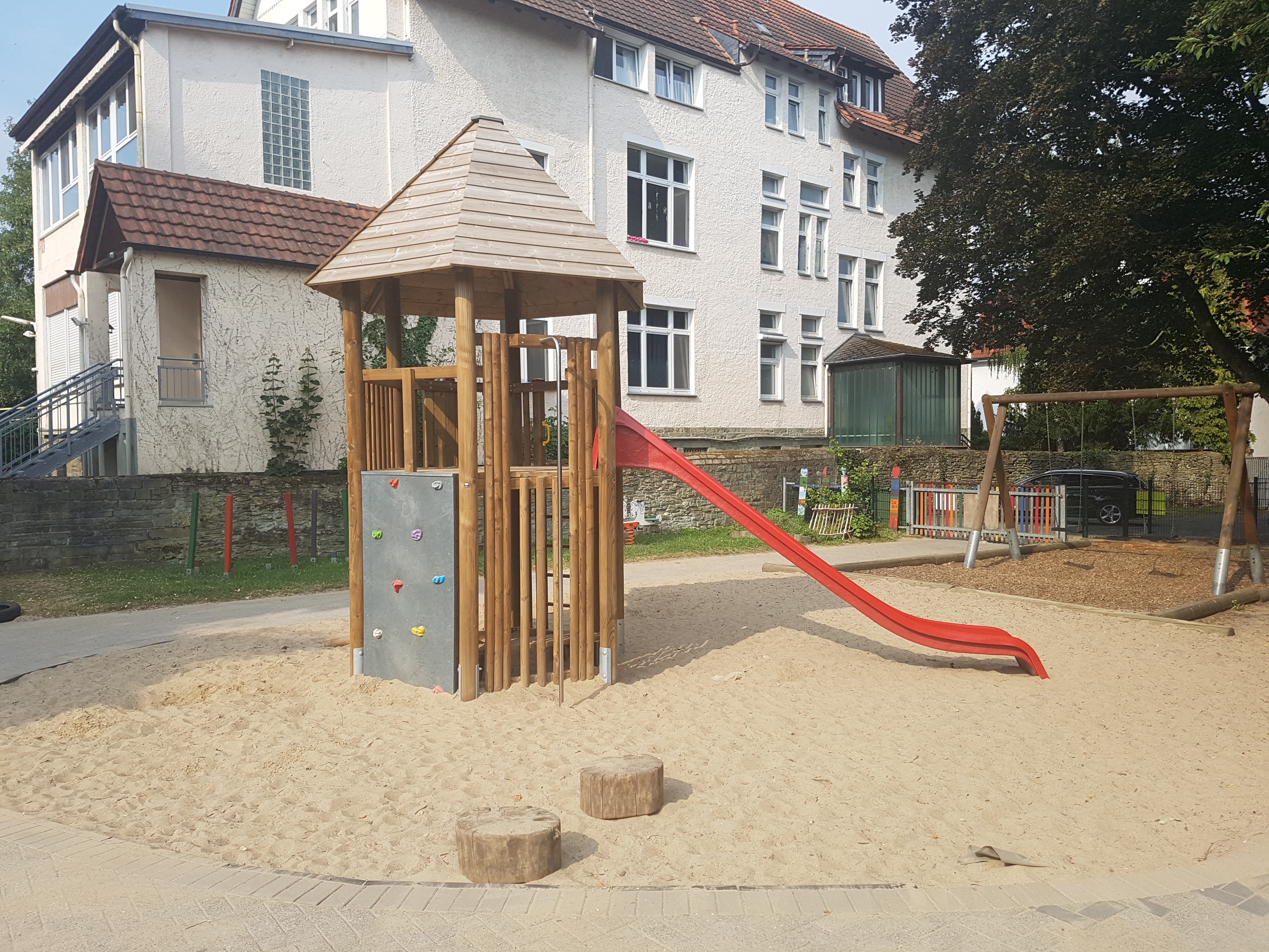 Moderner, sicherer Außenbereich mit abwechslungsreichen Spiel- und Bewegungszonen für den Kindergarten Regenbogen e.V. in Soest.