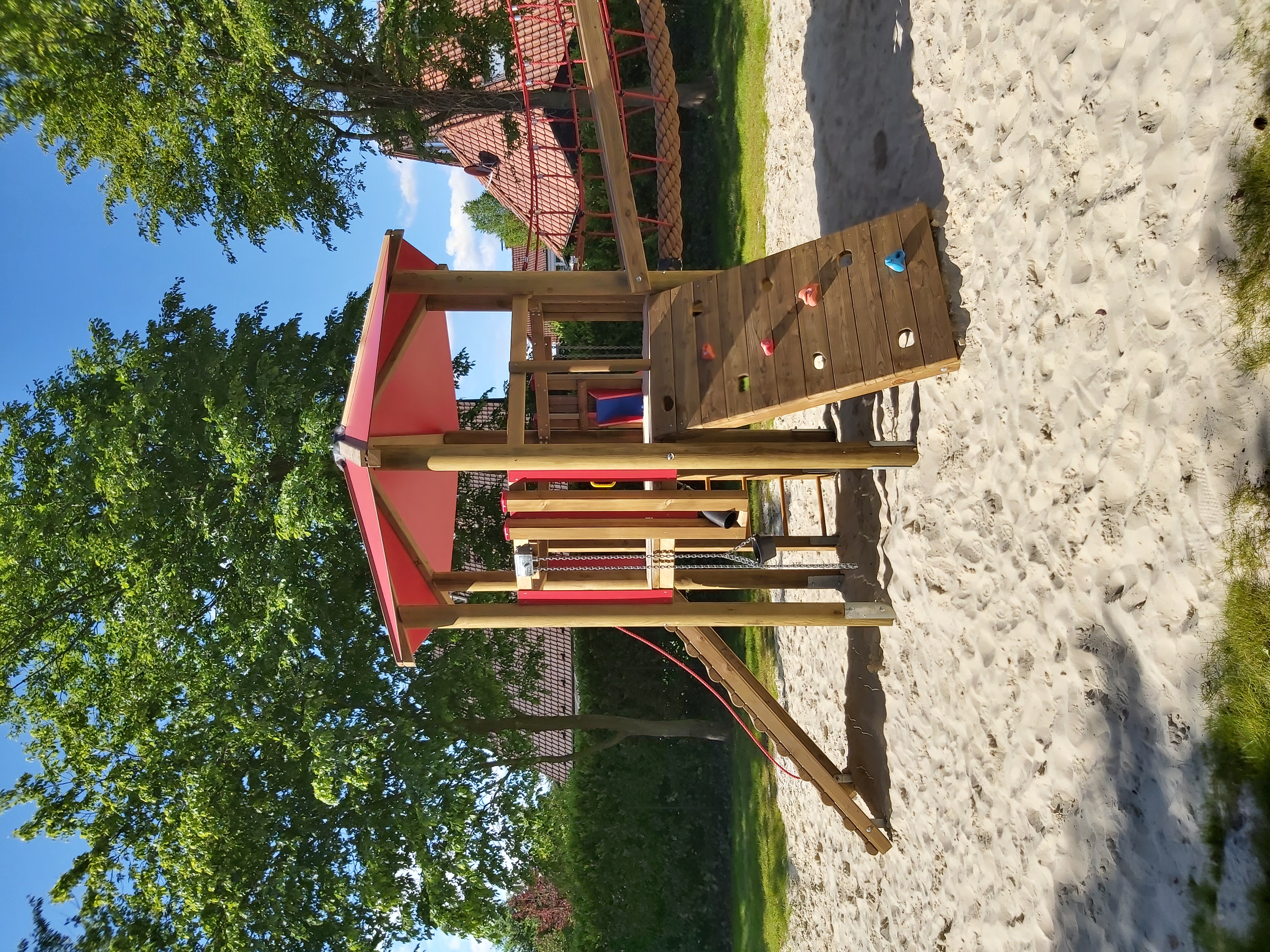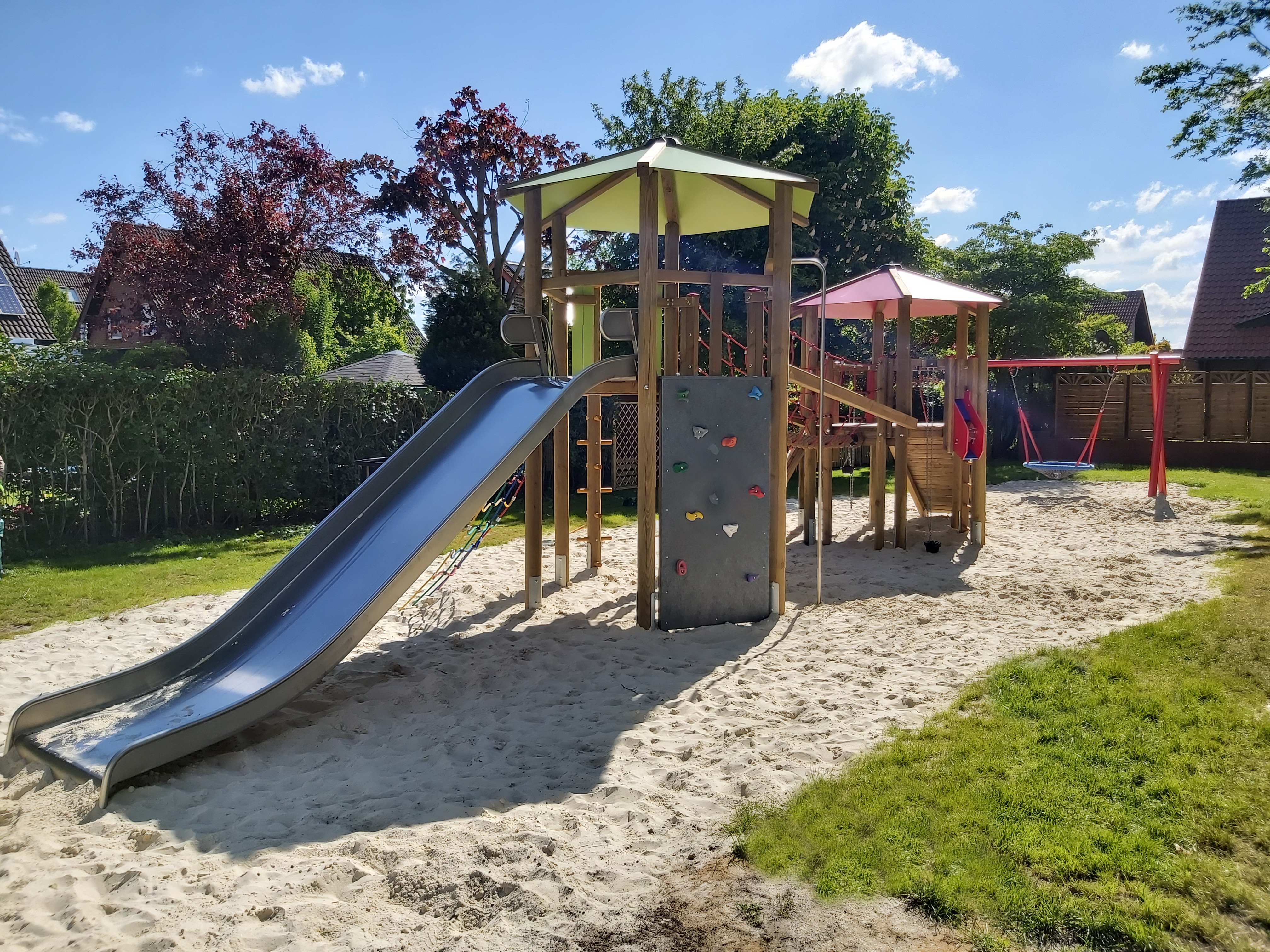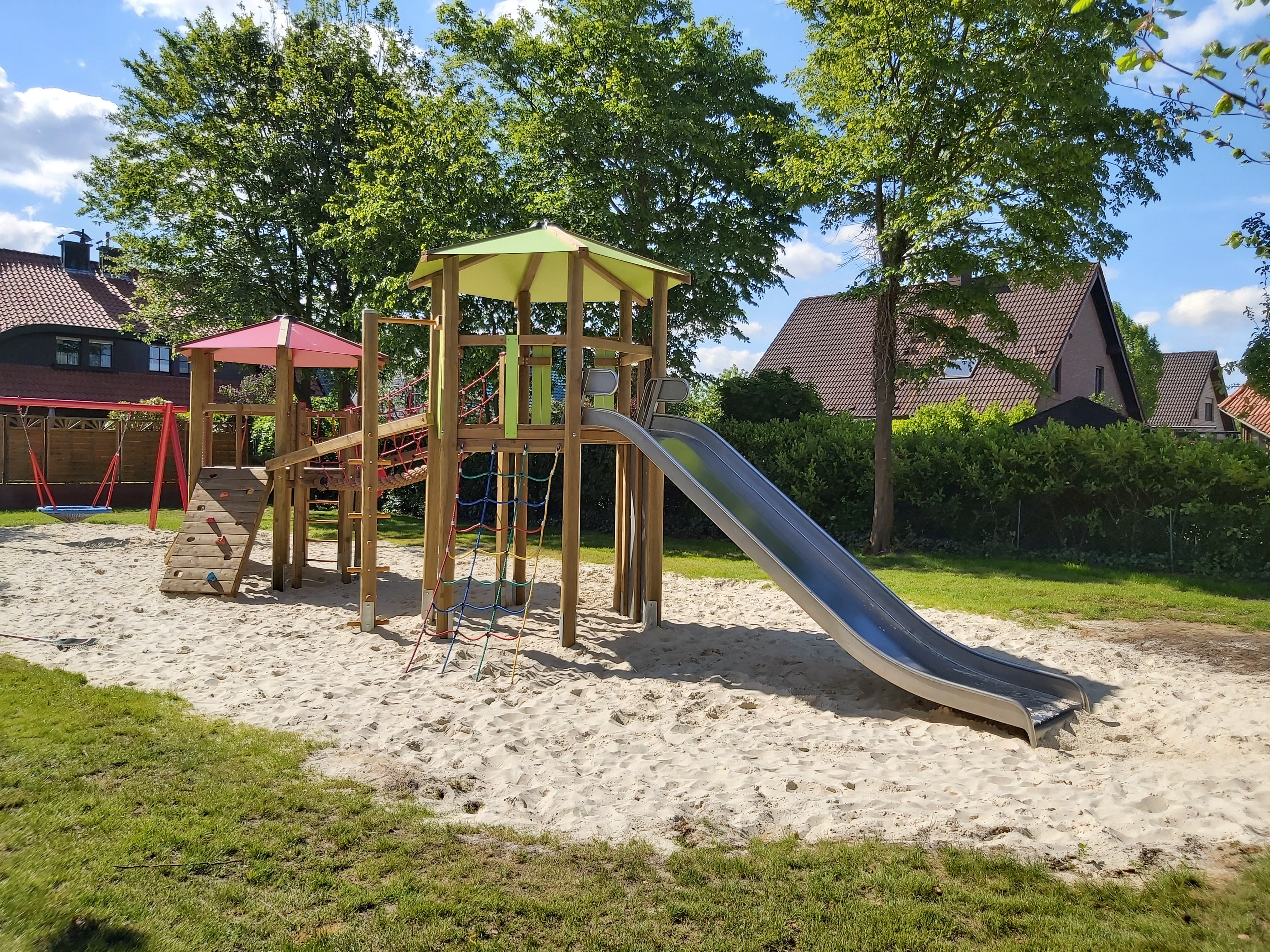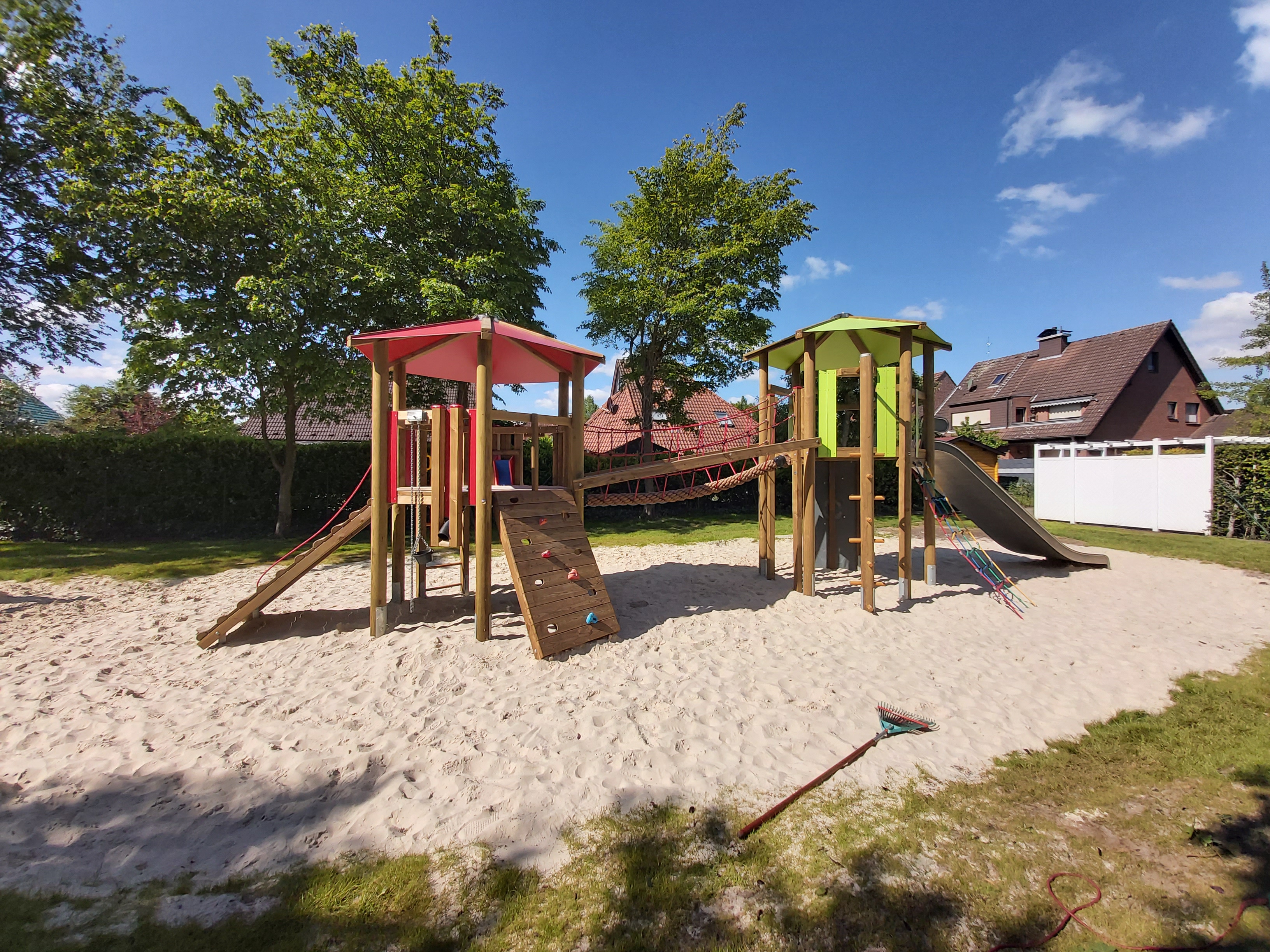 Der Spielplatz Perdekamp wurde mit einer robusten Doppelturmkombination ausgestattet, die verschiedene Kletter- und Spielaktivitäten für Kinder unterschiedlichen Alters ermöglicht.