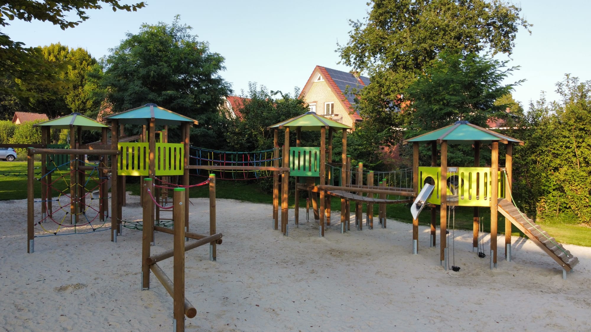 Der Spielplatz Stollbergstraße wurde mit einer großzügigen Fünfturm-Spielkombination ausgestattet, die Kindern verschiedene Kletter-, Kletter- und Spielmöglichkeiten bietet.
